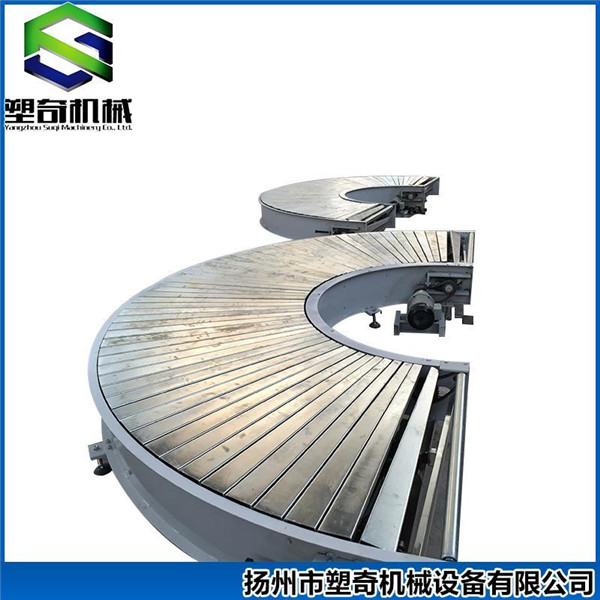 板链输送机适用于形状不规则物品的重载输送。链条选用空心大辊子带附件链条,在两侧同步链条的附件上用板状构件连接使输送方向形成连续的平板,因而运行平稳。该机与链式或辊筒输送机配合使用可实现转角输送。